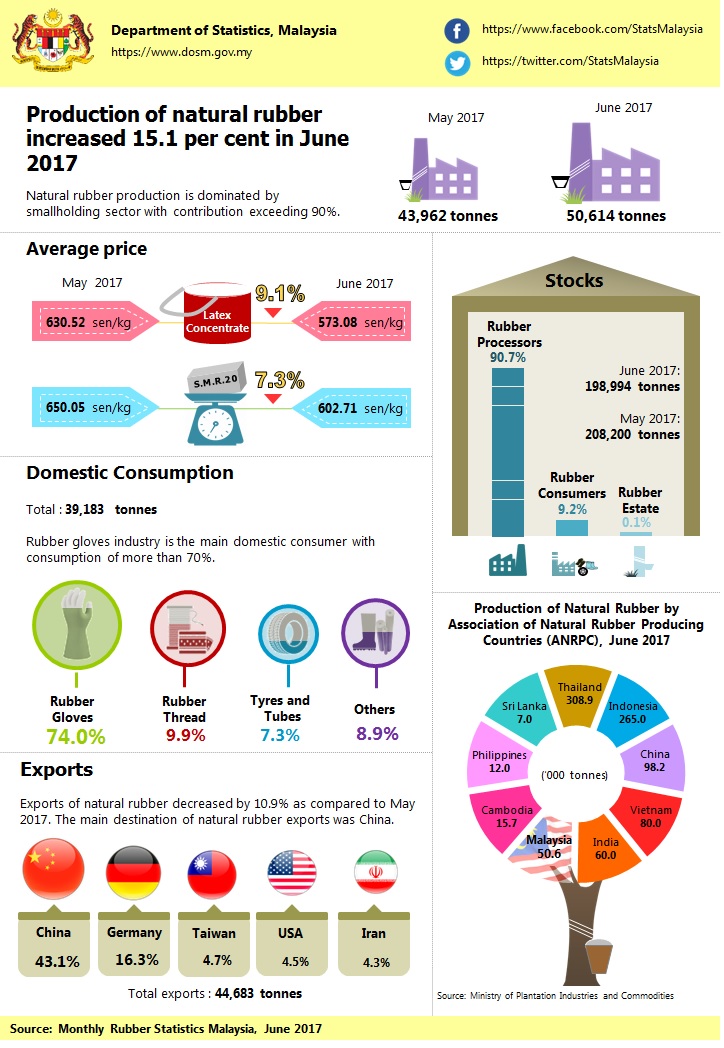 Natural rubber production in June 2017 was 50,614 tonnes, an increase of 15.1 per cent compared to 43,962 tonnes in the previous month. Smallholding sector was a major contributor to the production of natural rubber with a contribution exceeding 90 per cent.
