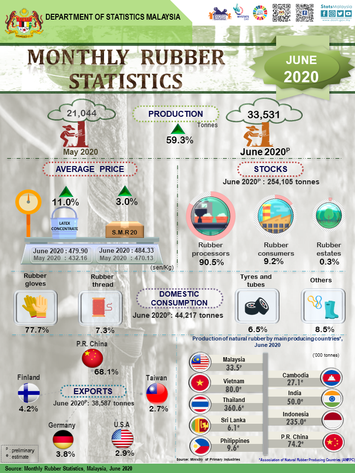Production of natural rubber increased 59.3 per cent in June 2020 to 33,531 tonnes as compared to 21,044 tonnes in the previous month. Comparison year on year showed a decrease of 8.9 per cent as compared to the same month in the previous year.