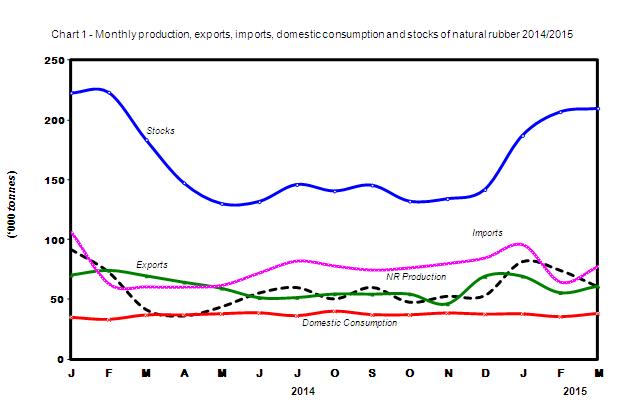 The level of stocks in March 2015 was recorded at 209,772 tonnes. Month-on-month and year-on-year comparison shows an increase in the level of NR stocks at 2,934 tonnes (+1.4%) and 25,506 tonnes (+13.8%) respectively.