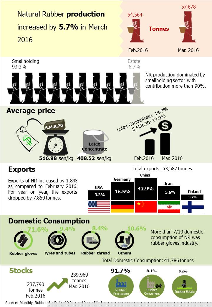 Natural Rubber (NR) production increased by 5.7% in March 2016
