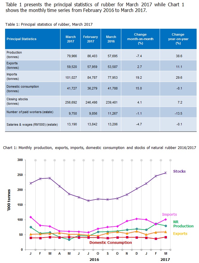 Production of NR in March 2017 decreased by 7.4 per cent to 79,966 tonnes as compared to previous month. The main contributor of NR production is from smallholding sector which is more than 90 per cent.