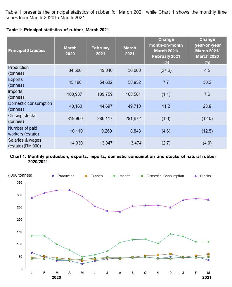 Total domestic consumption for natural rubber was 49,718 tonnes, an increase of 11.2 per cent as compared to the previous month. The use of natural rubber in rubber glove manufacturing industry continues to lead with 37,435 tonnes or 75.3 per cent of the total domestic consumption in March 2021.