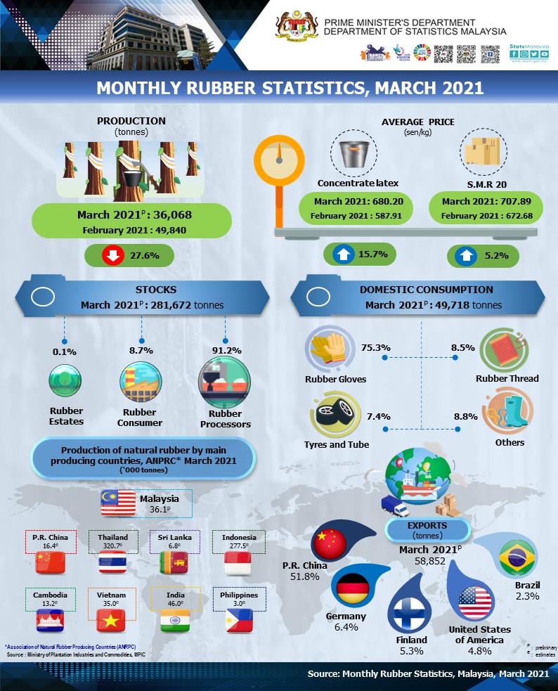 The full publication of the Monthly Rubber Statistics, March 2021 can be downloaded through eStatistik Portal.