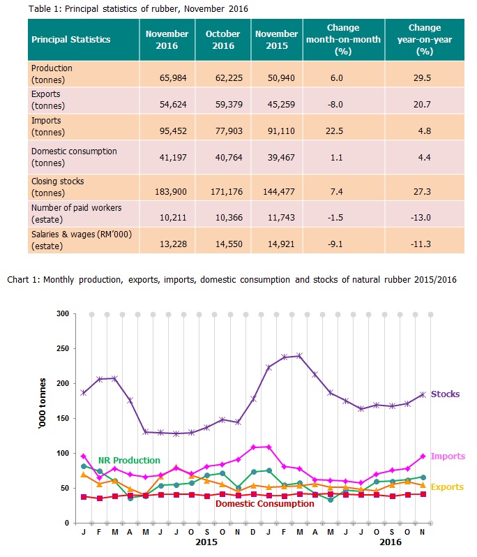 Table 1 presents the principal statistics of rubber for November 2016 while Chart 1 shows the monthly time series.