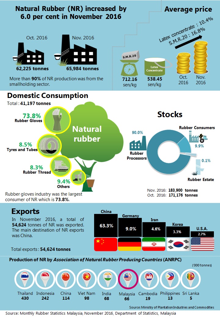 Natural rubber production rose by 6.0 per cent in November 2016 to 65,984 tonnes compared to last month. The smallholding sector was the main contributor to the natural rubber production which is 93.2 per cent.