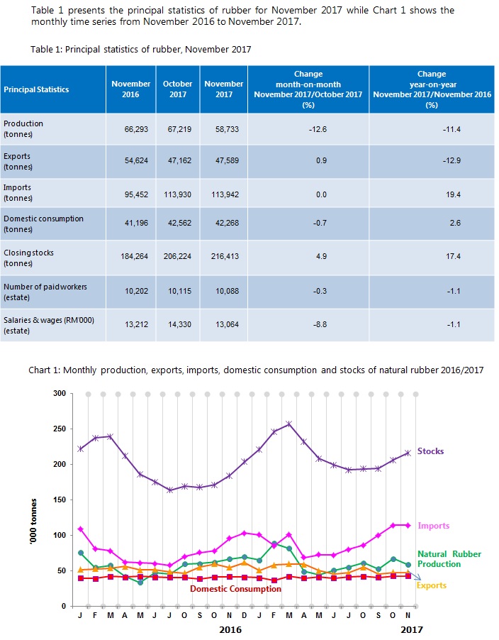Meanwhile in terms of stocks, the level of NR stocks increased 4.9 per cent to 216,413 tonnes at the end of November 2017.