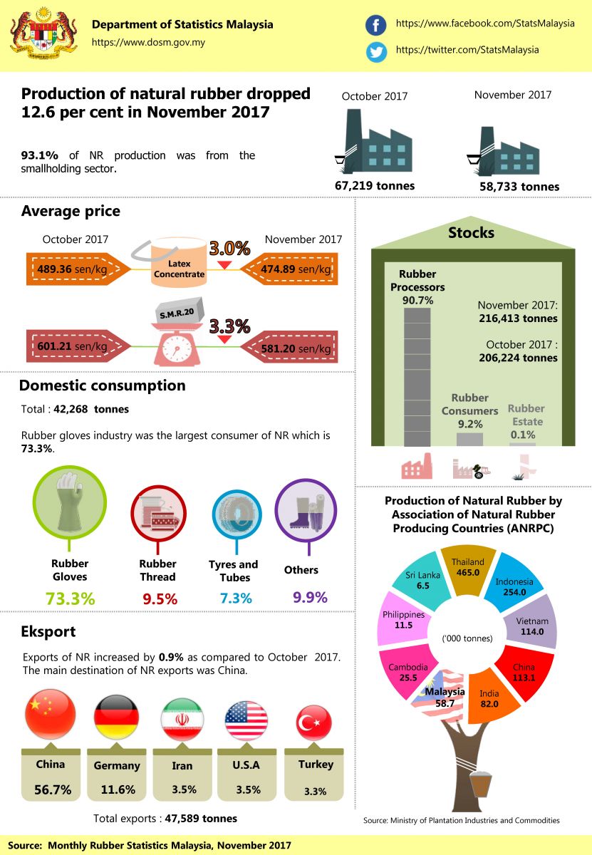 Natural rubber (NR) production dropped by 12.6 per cent in November 2017 to 58,733 tonnes compared to October 2017. Smallholding sector is the main contributor of NR production which is more than 90 per cent.