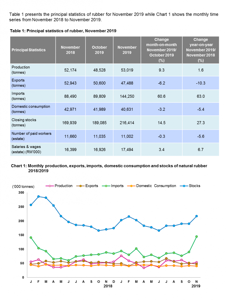 Stocks of natural rubber was 216,414 tonnes in November 2019 as compared to 189,085 tonnes in October 2019, an increase of 14.5 per cent.