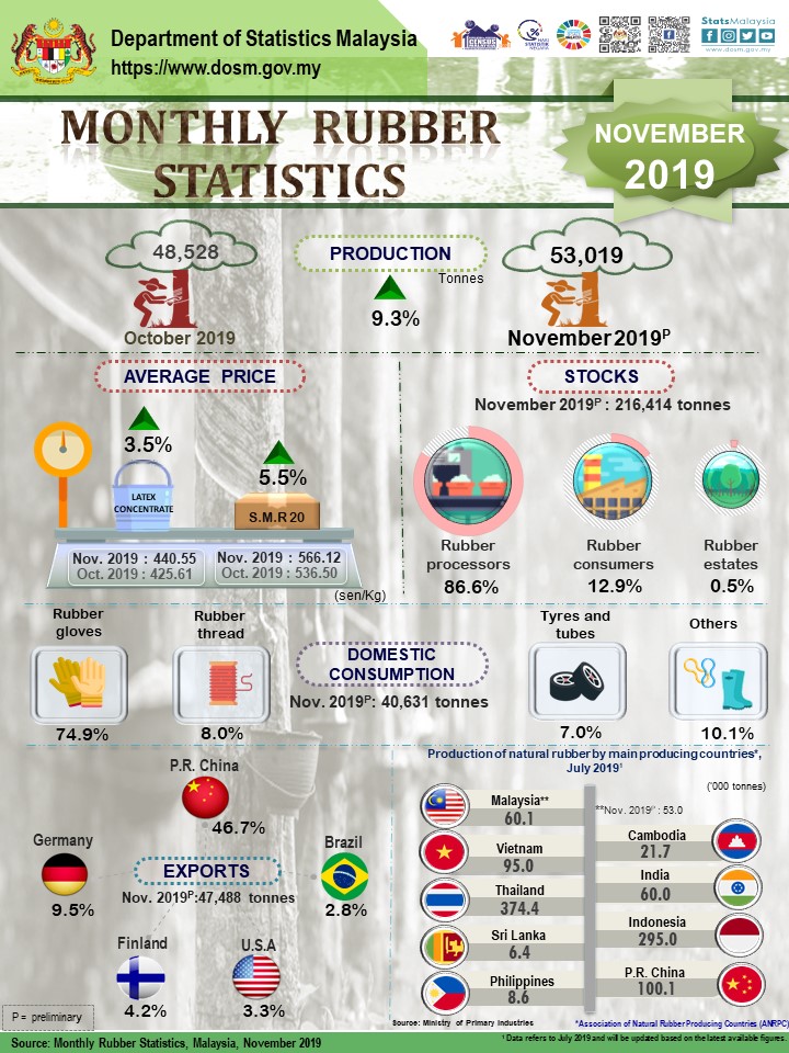 Malaysia's natural rubber production increased 1.6 per cent in November 2019 to 53,019 tonnes as compared to the same month in the previous year. Comparison month on month also showed an increase of 9.3 per cent from 48,528 tonnes, which is recorded in October 2019.