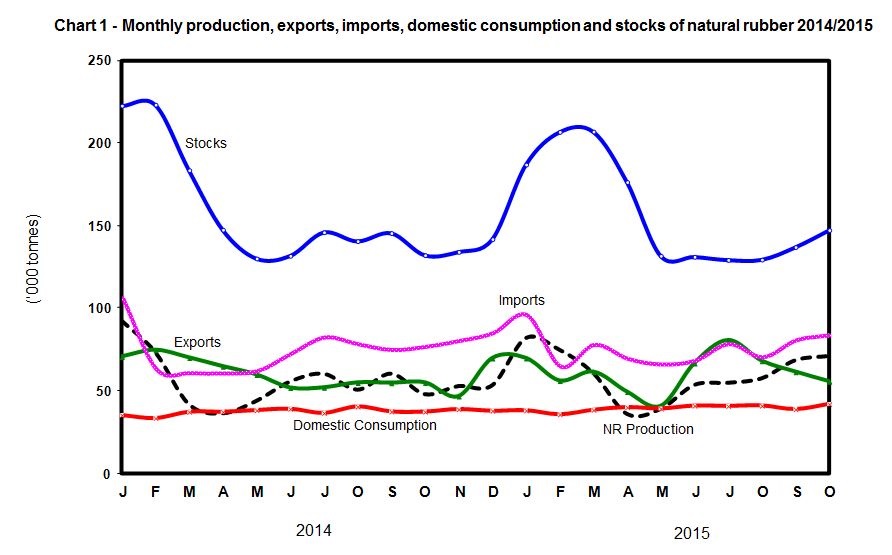 The level of stocks of NR held at the end of October 2015 rose by 7.4 per cent to 147,318 tonnes compared to the level of stocks of the previous month. For year-on-year comparison, an increase of 11.3 per cent was recorded. The biggest portion of the stocks was held by Rubber Processors (87.7%).
