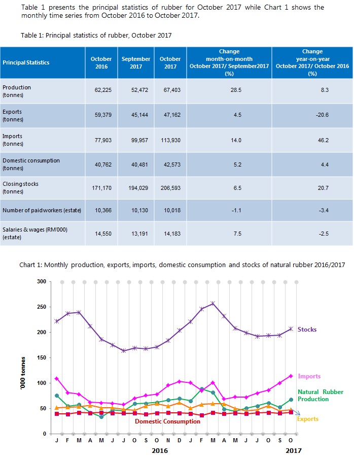 At the end of October 2017, level of NR stocks increased by 12,564 tonnes (6.5%) to 206,593 tonnes.