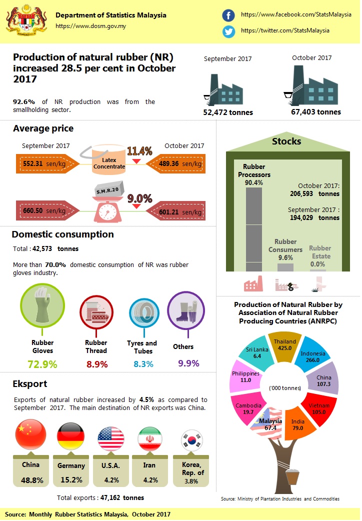 Average monthly price of Latex Concentrate and Standard Malaysian Rubber 20 in October 2017 were 489.36 sen per kilogramme and 601.21 sen per kilogramme, decreased by 11.4 per cent and 9.0 per cent respectively from September 2017.