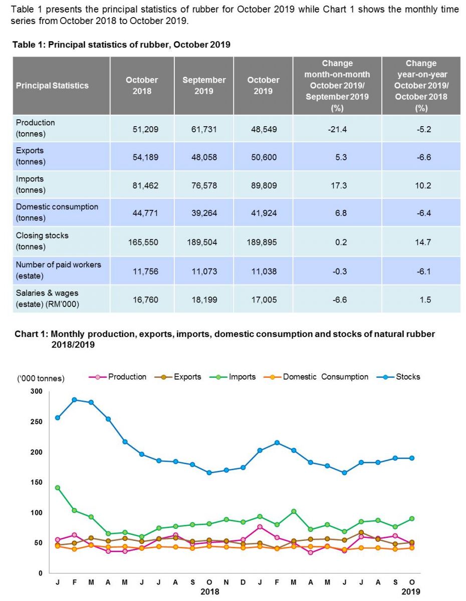 Stocks of natural rubber was 189,895 tonnes in October 2019 as compared to 189,504 tonnes in September 2019, an increase of 0.2 per cent.