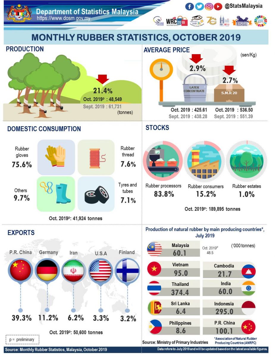 Natural rubber production in October 2019 decreased 5.2 per cent year on year