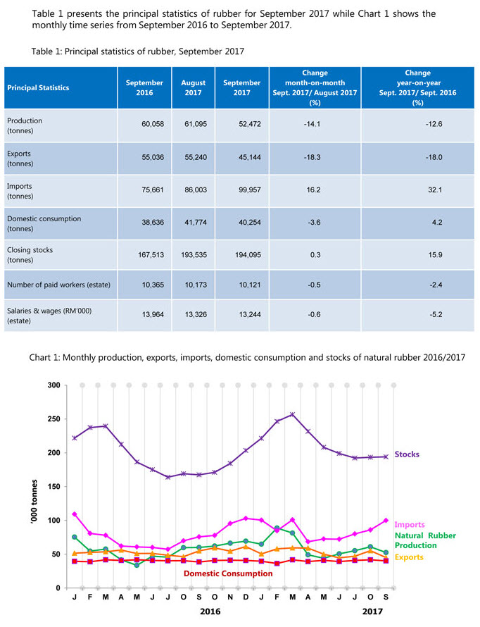 Meanwhile, domestic consumption of NR in September 2017 decreased by 3.6 per cent to 40,254 tonnes from previous month 73.5 per cent of domestic consumption dominated by the rubber glove industry.