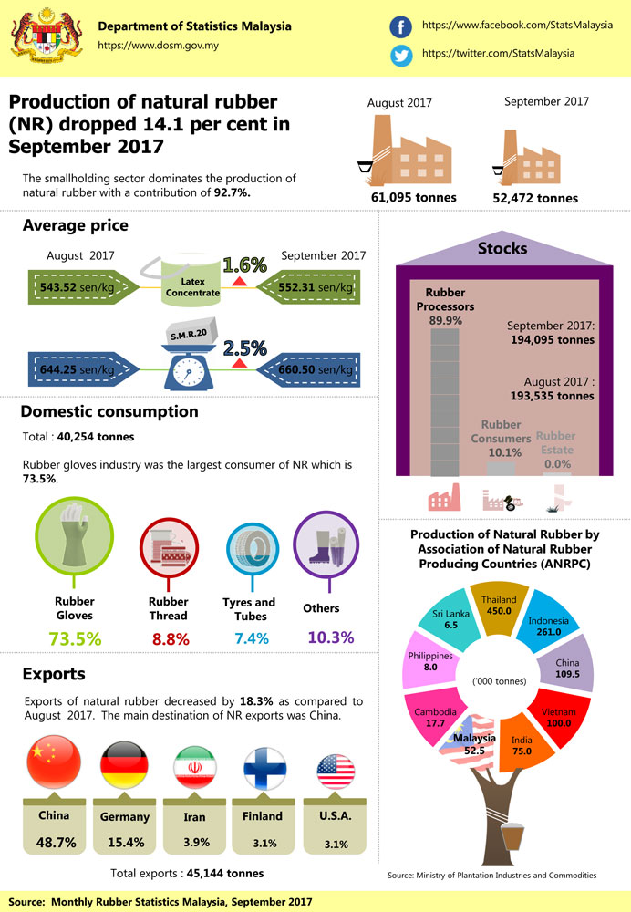 Natural rubber (NR) production dropped by 14.1 per cent in September 2017 to 52,472 tonnes compared to August 2017. Smallholding sector is the main contributor of NR production which is more than 90 per cent.