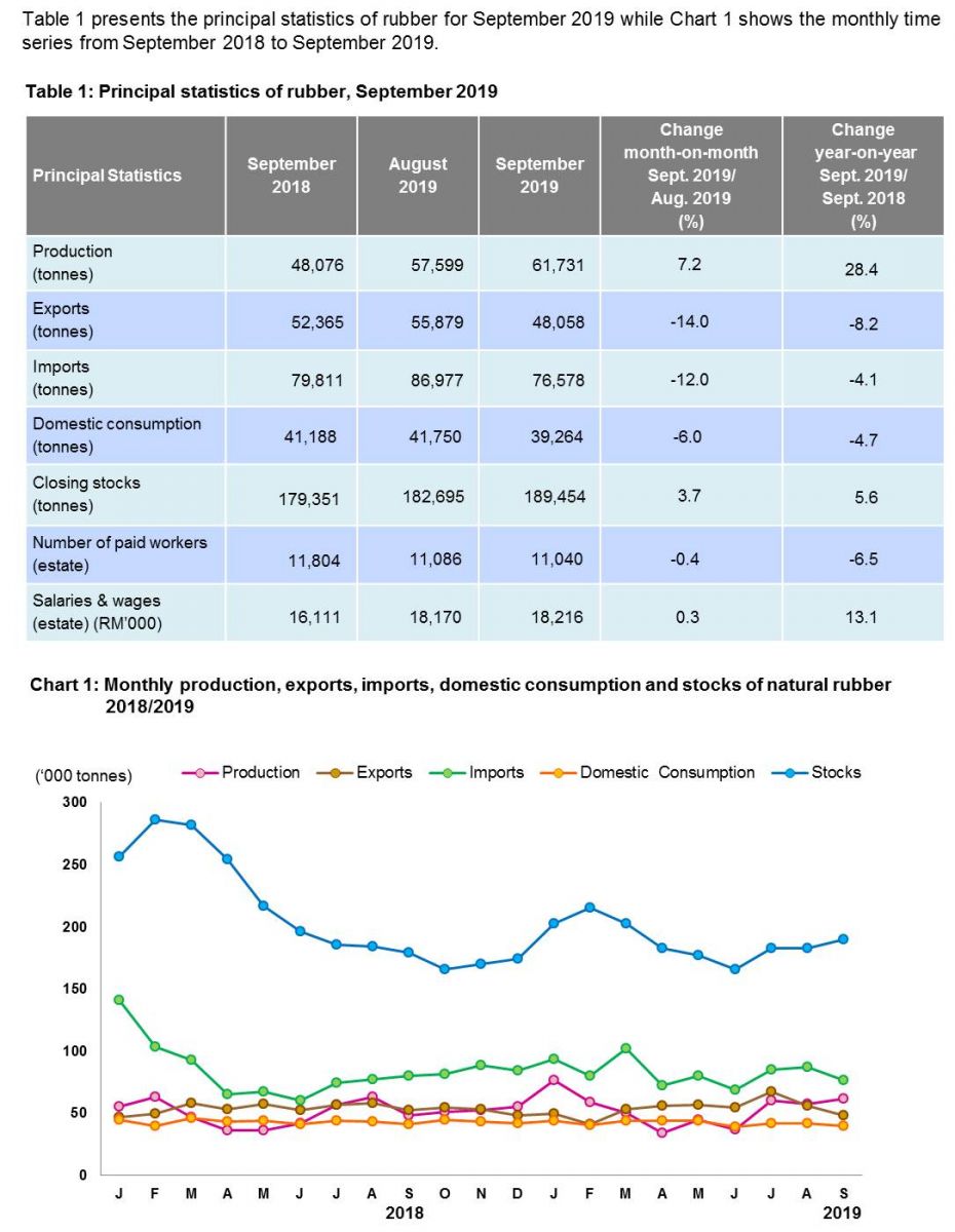Stocks of natural rubber was 189,454 tonnes in September 2019 as compared to 182,695 tonnes in August 2019, an increase of 3.7 per cent.