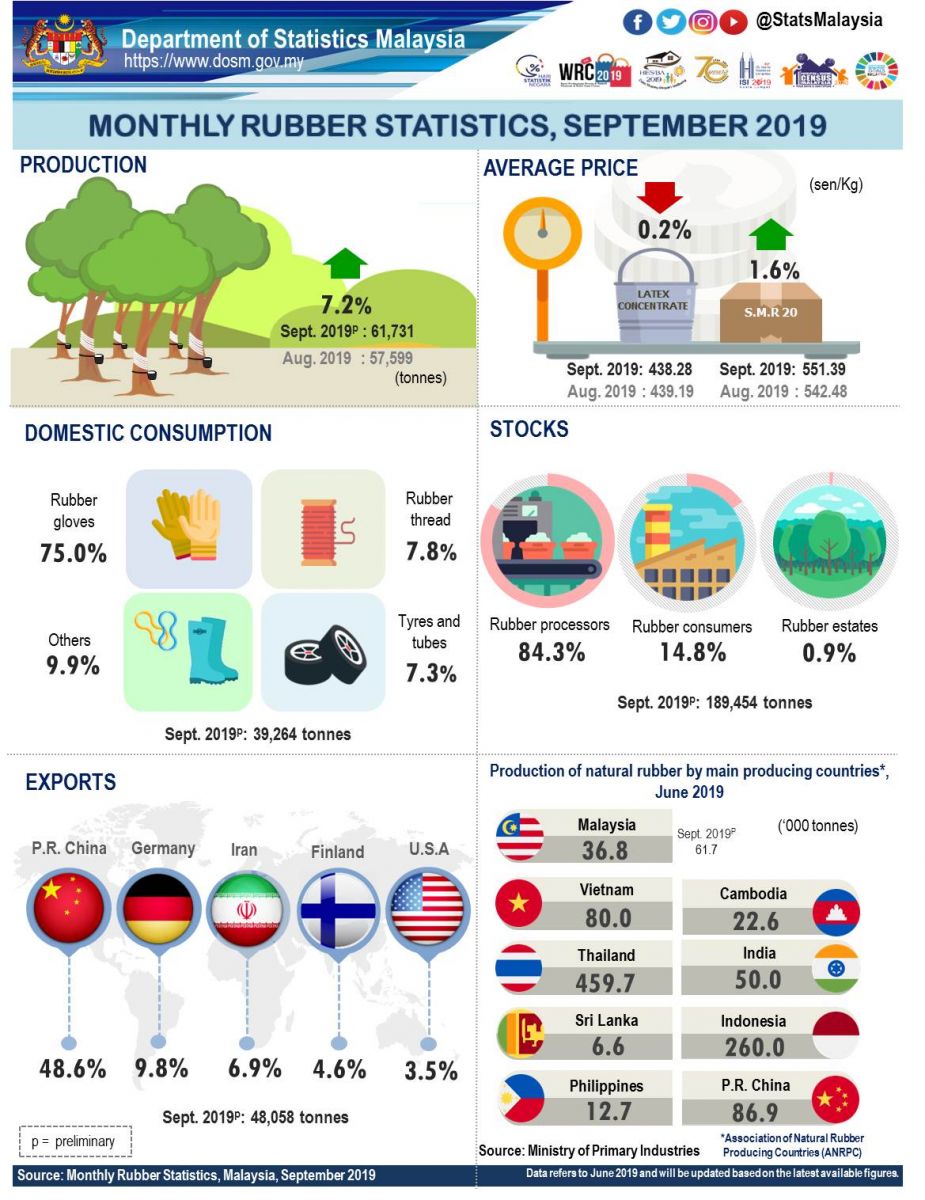 Malaysia's natural rubber production in September 2019 increased 7.2 per cent as compared to the previous month, from 57,599 tonnes to 61,731 tonnes. For year on year comparison, the production also showed an increase of 28.4 per cent as compared to September 2018.
