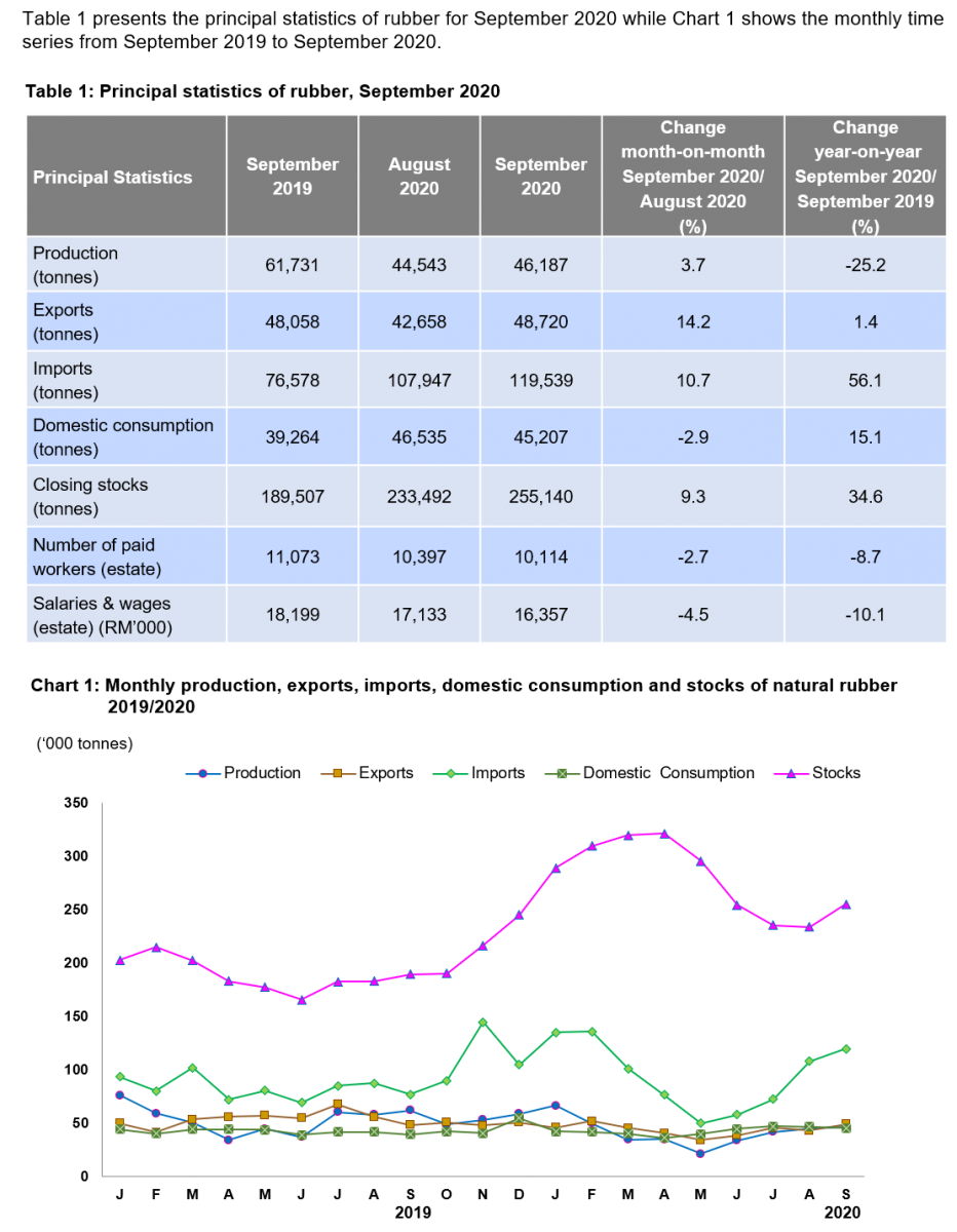 Production of natural rubber increased 3.7 per cent in September 2020 to 46,187 tonnes as compared to 44,543 tonnes in the previous month. Meanwhile, compared to the same month in the previous year, it recorded a decrease of 25.2 per cent.