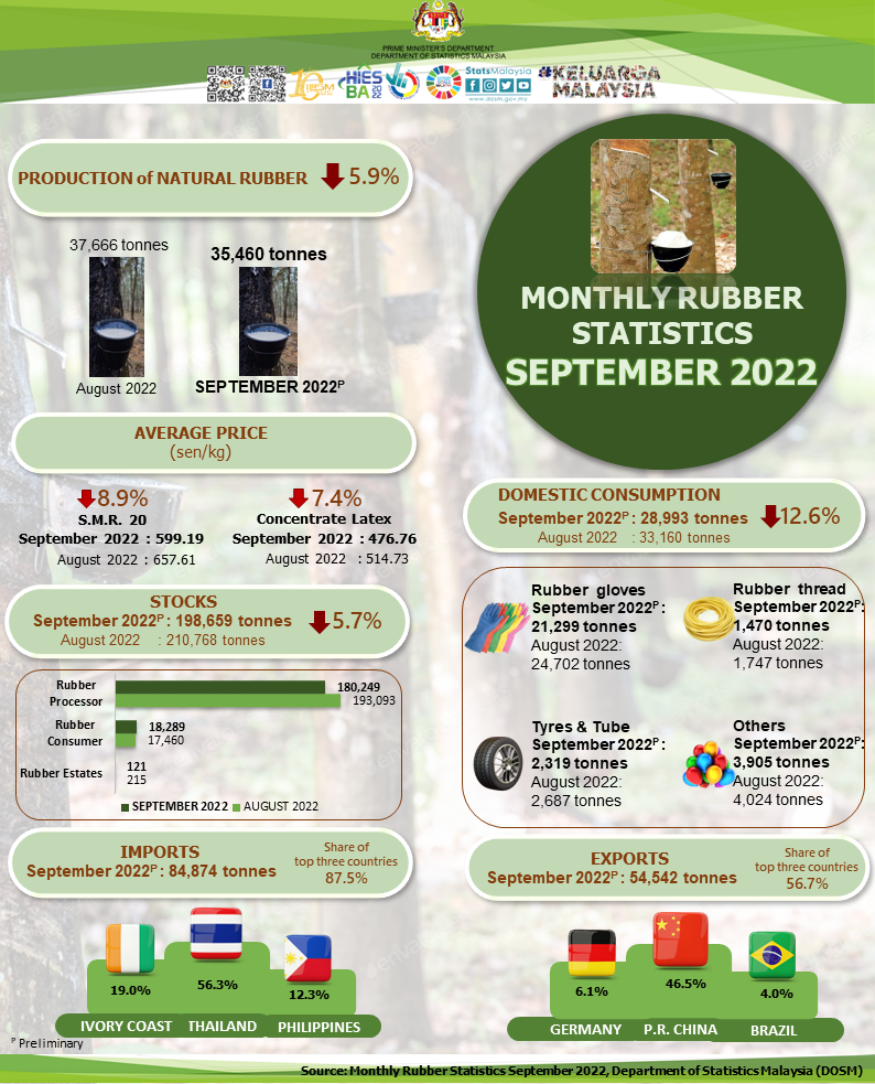The full publication of the Monthly Rubber Statistics, September 2022 can be downloaded through eStatistik portal.