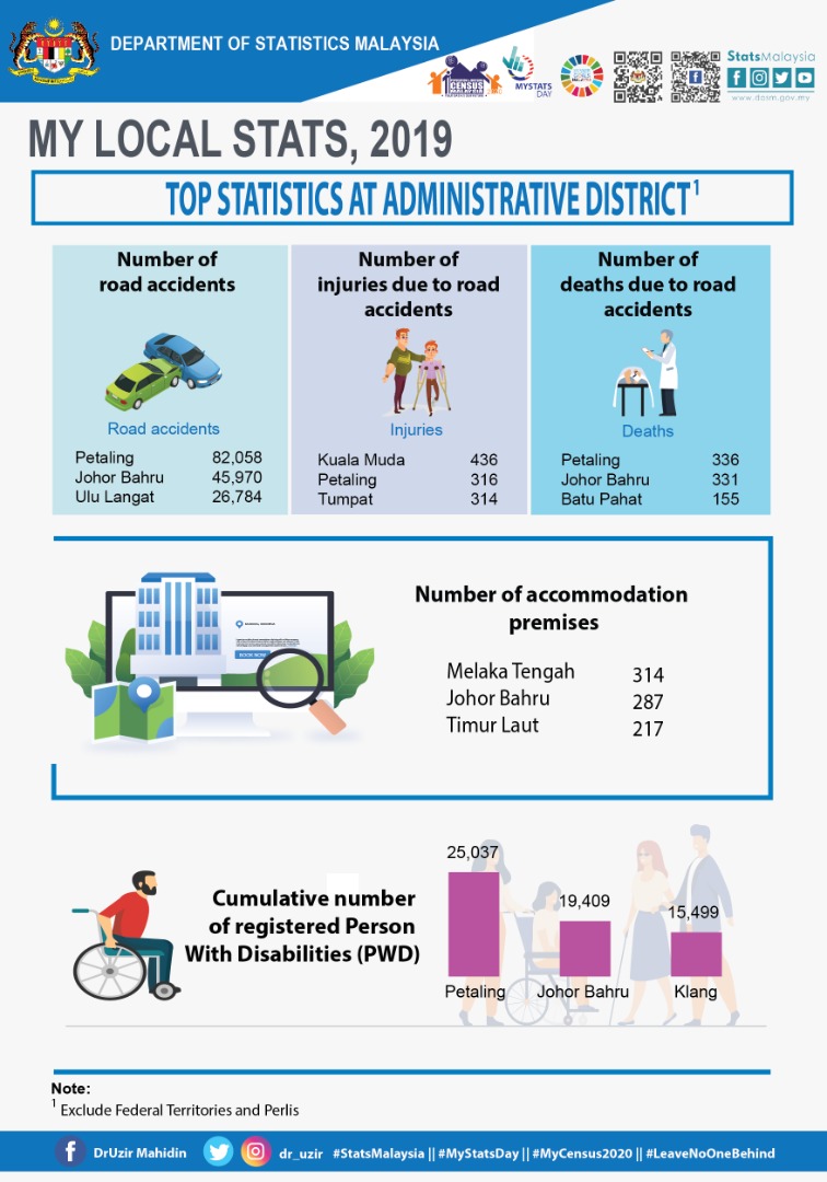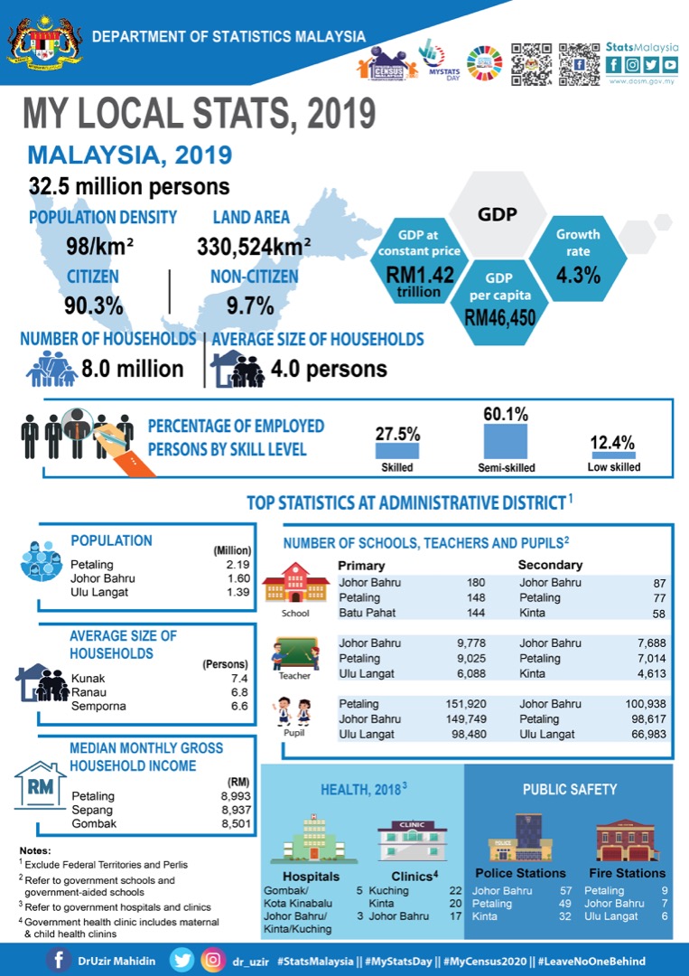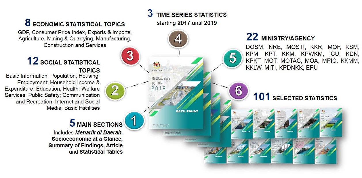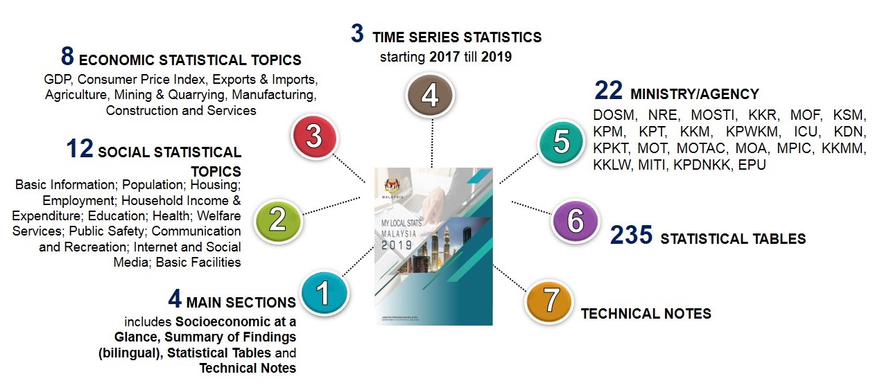 My Local Stats 2019 presents the main socioeconomic statistics at administrative district level for the time series of 2017 till 2019. For the first time, My Local Stats is published in149 publications consist of one publication at national level, 143 publications for existing districts (before 2013), one publication covering 13 new districts and four publications for the Federal Territories and Perlis.