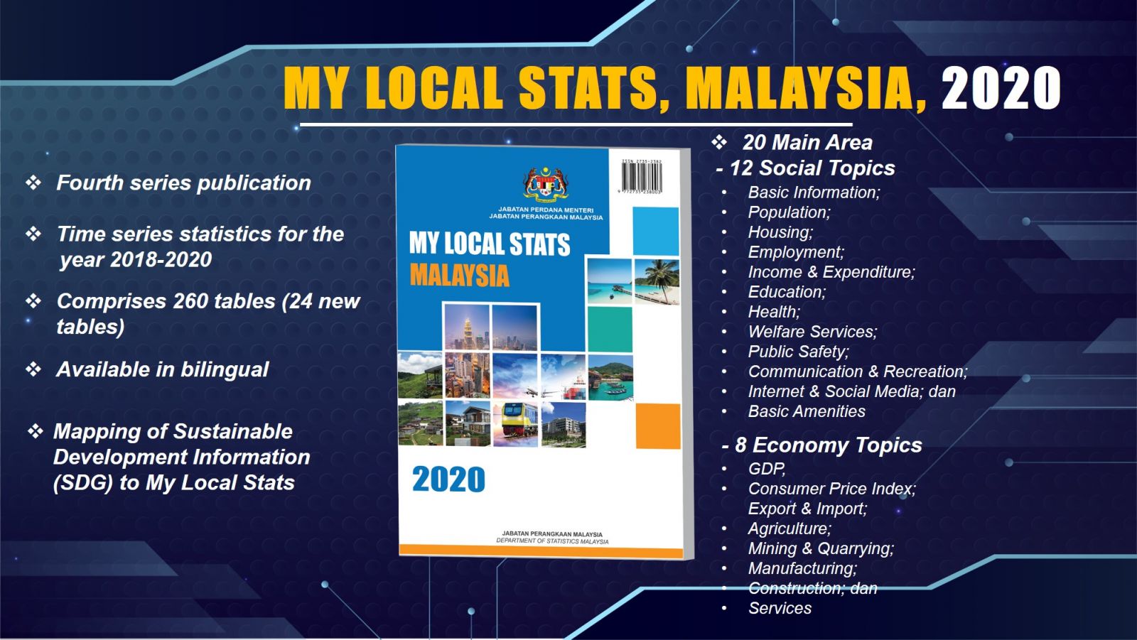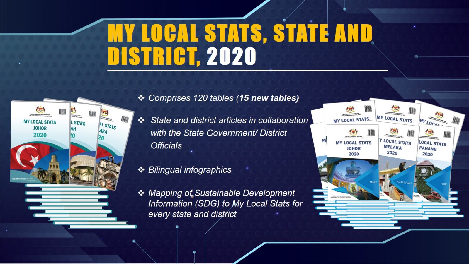 My Local Stats 2020, the fourth series since 2017. This year, My Local Stats publication is released for all 156 administrative districts. Apart from that, it also publishes one publication for the whole country, 13 publications by states and three publications by Federal Territory. This publication provides the statistics needed for sustainable development planning. It integrates economic and social statistics at the administrative district level for the 2018 to 2020 time series.