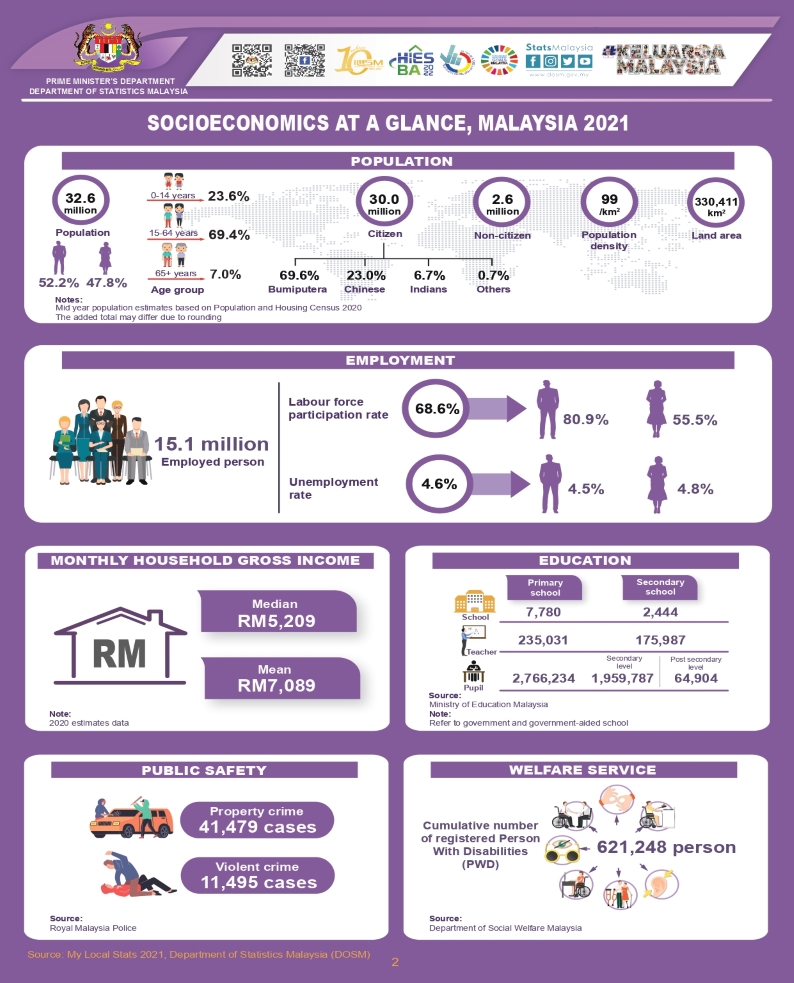 As for population, the total population in Malaysia was estimated at 32.6 million in 2021. According to mid-year population estimates based on Population and Housing Census 2020, Petaling, Selangor was the district with the highest population at 2.32 million followed by Johor Bahru, Johor (1.72 million) dan Ulu Langat, Selangor (1.39 million).