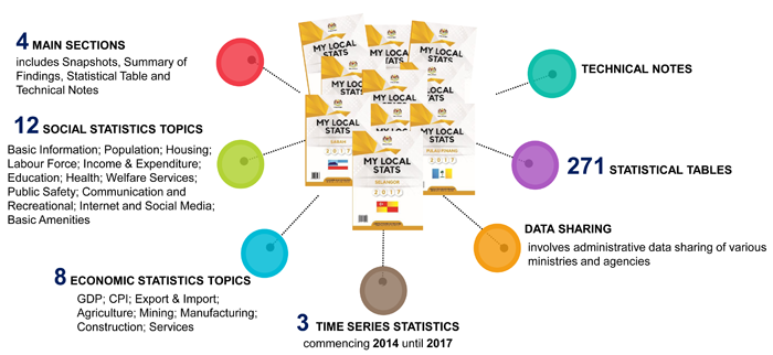 My Local Stats publication consists of two (2) Divisions namely Social and Economic. The Social division contains Basic Information; Population; Housing; Labour Force; Household Income & Expenditure; Education; Health; Welfare Services; Public Safety; Communication and Recreation; Internet and Social Media; and Basic Amenities. Meanwhile the Economic division contains Gross Domestic Product (GDP); Consumer Price Index (CPI); Export & Import; Agriculture; Mining and Quarrying; Manufacturing; Construction and Services.