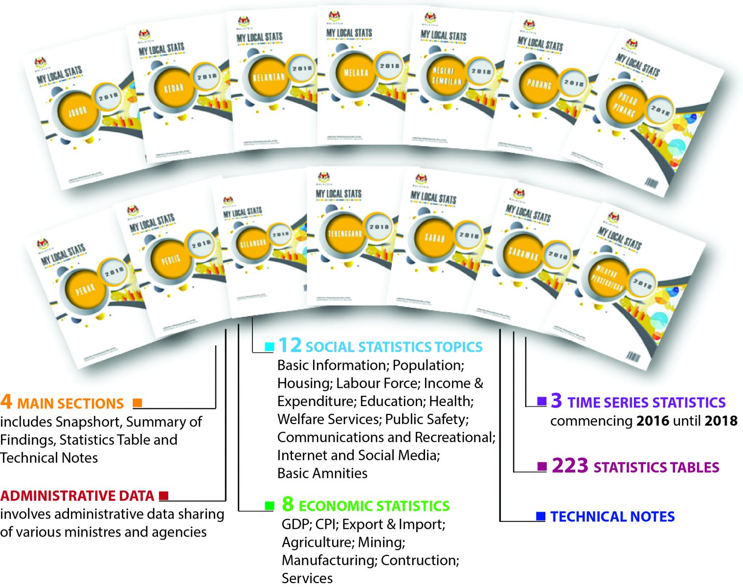 My Local Stats publication consists of two (2) Divisions namely Social and Economic. The Social division contains Basic Information; Population; Housing; Labour Force; Household Income & Expenditure; Education; Health; Welfare Services; Public Safety; Communication and Recreation; Internet and Social Media; and Basic Amenities. Meanwhile the Economic division contains Gross Domestic Product (GDP); Consumer Price Index (CPI); Export & Import; Agriculture; Mining and Quarrying; Manufacturing; Construction and Services.