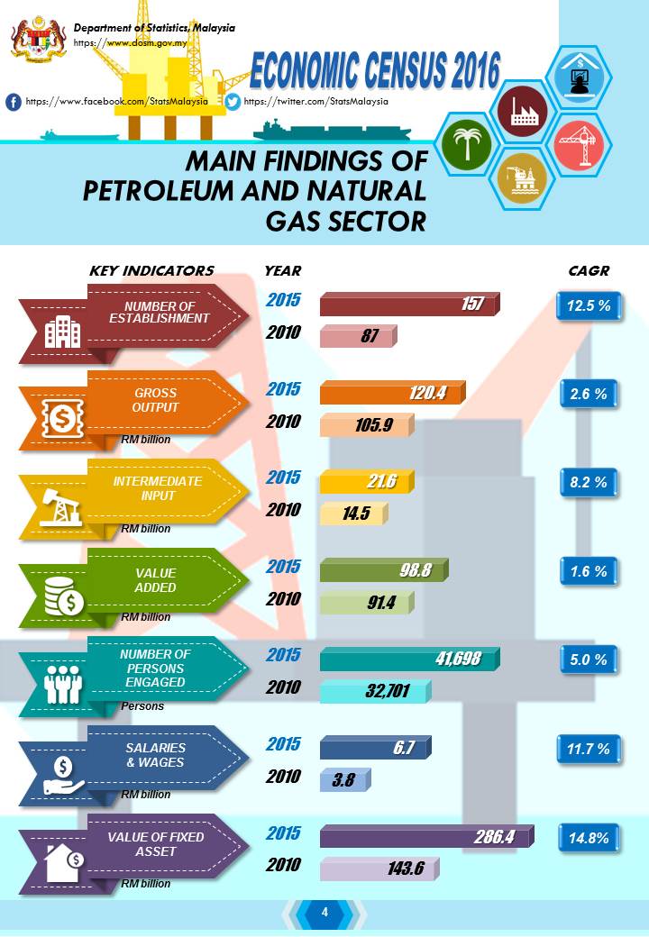 In 2015, a total of 157 establishments were engaged in the petroleum and natural gas industry as compared to 87 establishments in 2010, an increase of 12.5 per cent compound annual growth rate (CAGR) for the period 2010 to 2015. The value of gross output recorded RM120.4 billion as compared to RM105.9 billion in 2010 (CAGR: 2.6%). The total number of persons engaged increased to 41,698 persons as compared to 32,701 persons in 2010 (CAGR: 5.0%). Thus salaries & wages paid rose to RM6.7 billion from RM3.8 billion in 2010 (CAGR: 11.7%).