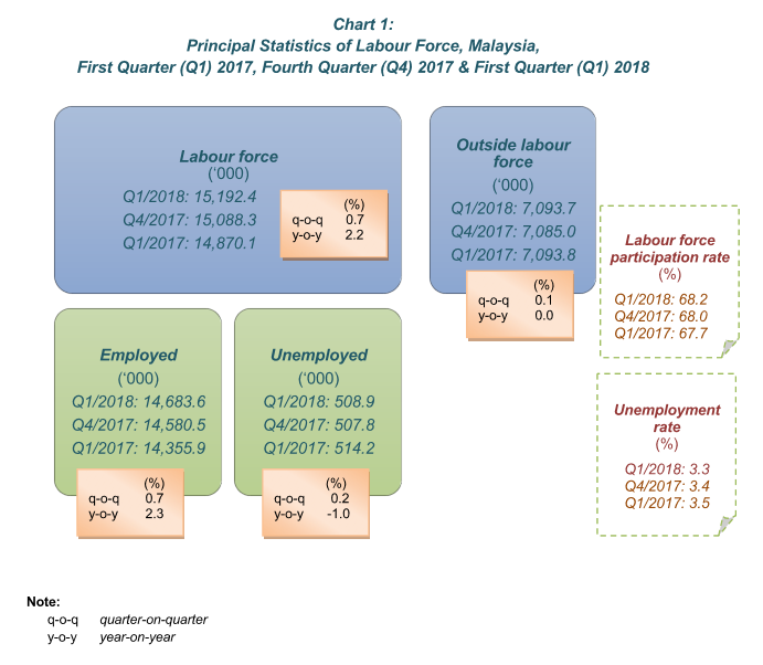 Labour force participation rate (LFPR) in the first quarter 2018 was 68.2 per cent, rose 0.2 percentage points as compared to the fourth quarter 2017. Hence, another 31.8 per cent of the working age population were outside the labour force. Meanwhile, unemployment rate decreased 0.1 percentage point to 3.3 per cent in first quarter 2018.