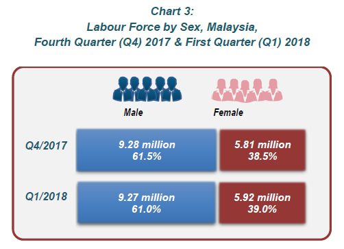 Year-on-year, the increase of labour force participation rate in Malaysia (0.5 percentage points) was contributed by the increase in female labour force participation rate by 0.9 percentage points.