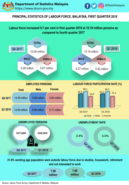 Labour force in Malaysia increased 0.7 per cent to 15.19 million persons in the first quarter 2018 as compared to 15.09 million persons in the previous quarter. These was contributed by the increase of 0.7 per cent or 103,100 employed persons to 14.68 million persons.