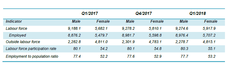In the first quarter 2018, there was 39.0 per cent females in the labour market, an increase of 0.5 percentage points or 110,000 persons to 5.92 million persons as compared to the previous quarter.