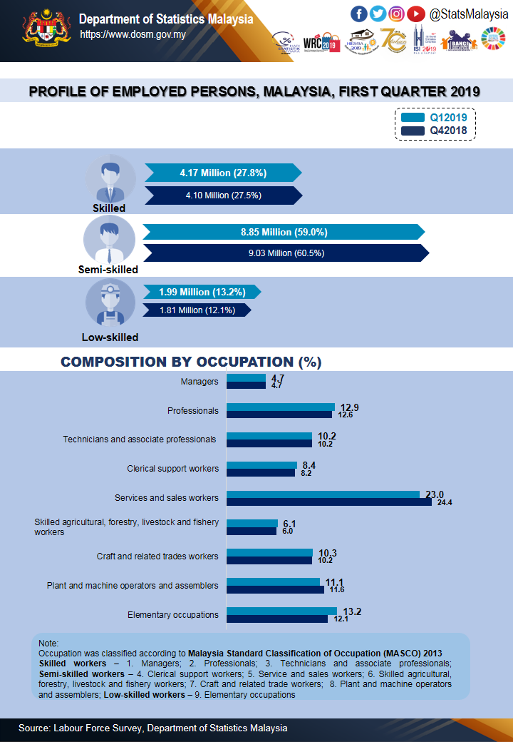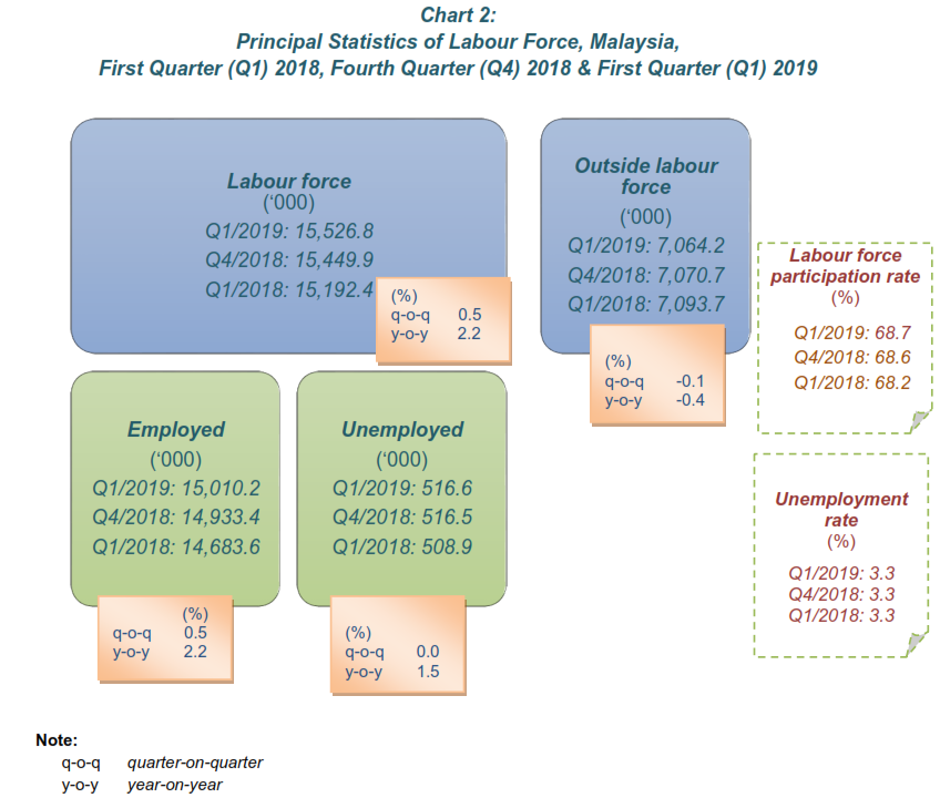 The detailed information and technical notes are published in the Labour Force Survey Report, Malaysia, First Quarter 2019. This report is accessible and downloadable free of charge through the eStatistik application in DOSM web page, www.dosm.gov.my.