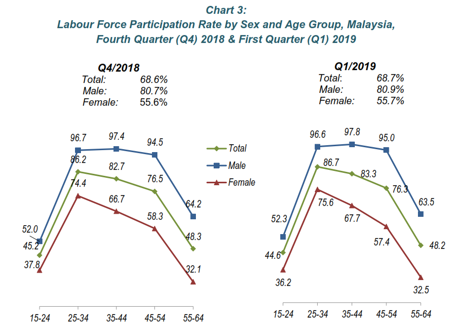 Male LFPR also increased by 0.2 percentage points to 80.9 per cent in the first quarter 2019. Overall, male LFPR remained consistently higher than female for all age groups.The age group that recorded more than 90 per cent of LFPR were 25-34 years (96.6%),35-44 years (97.8%) and 45-54 years (95.0%) [Chart 3].