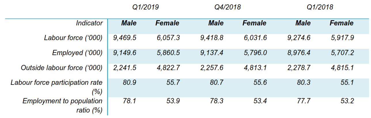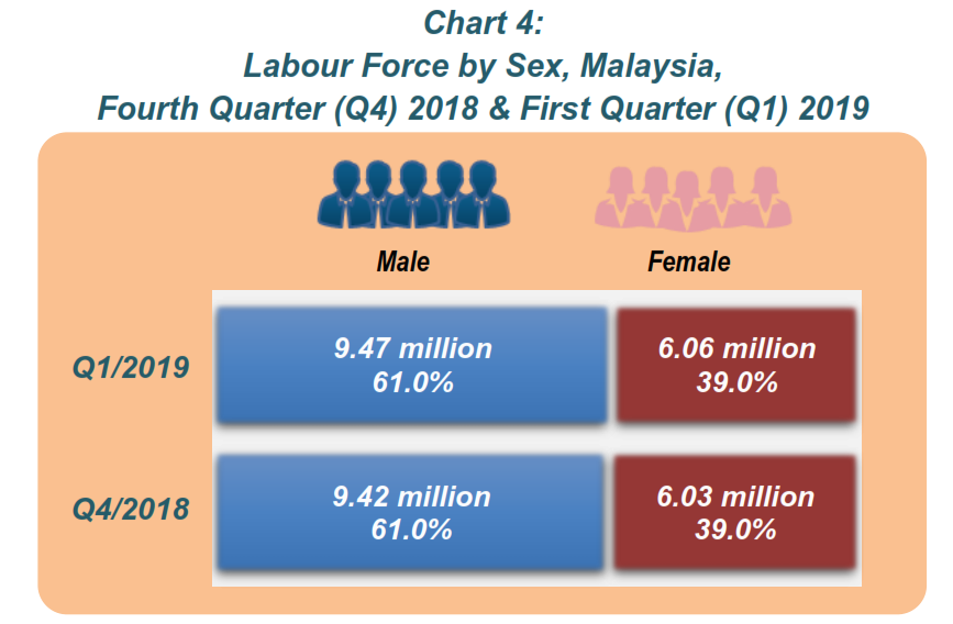 In the first quarter of 2019, the labour force was represented by 61.0 per cent males (9.47 million) and 39.0 per cent females (6.06 million). The number of labour force for both males and females increased by 50,700 persons and 26,200 persons respectively as compared to the fourth quarter of 2018.