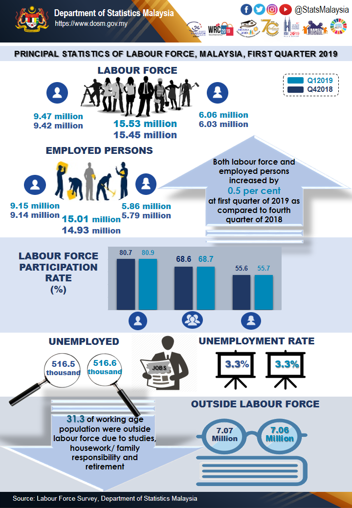 Labour force in Malaysia increased 2.2 per cent as compared to the first quarter of 2018 to 15.53 million persons. The employed persons also recorded an increase of 2.2 per cent in the same period to 15.01 million persons.