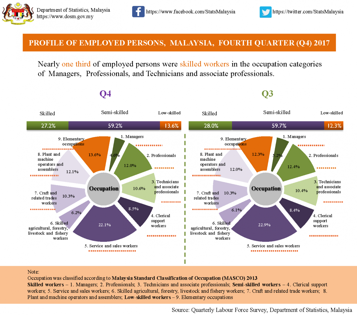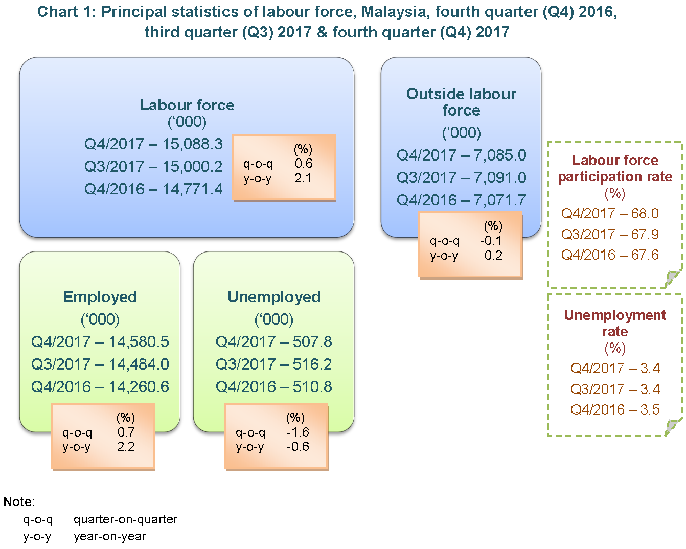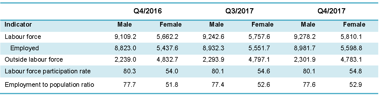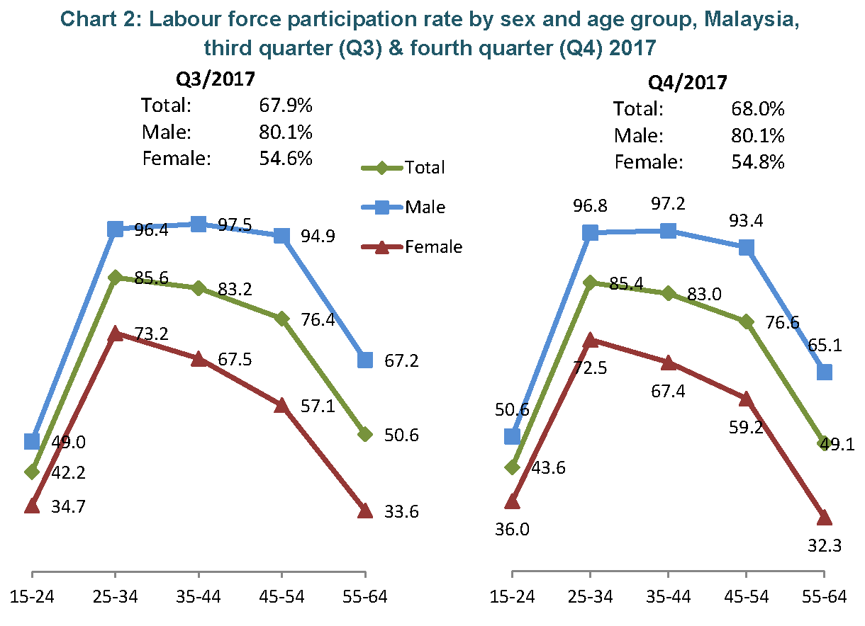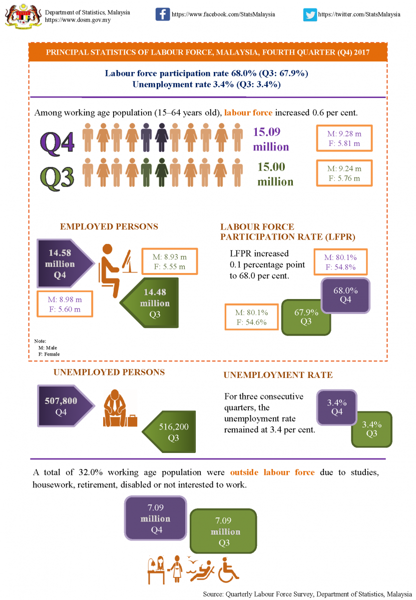 Labour force participation rate (LFPR) in the fourth quarter 2017 was 68.0 per cent, rose 0.1 percentage point as compared to the third quarter 2017. Hence, another 32.0 per cent of the working age population were outside the labour force. Meanwhile, unemployment rate remained unchanged at 3.4 per cent for three consecutive quarters.