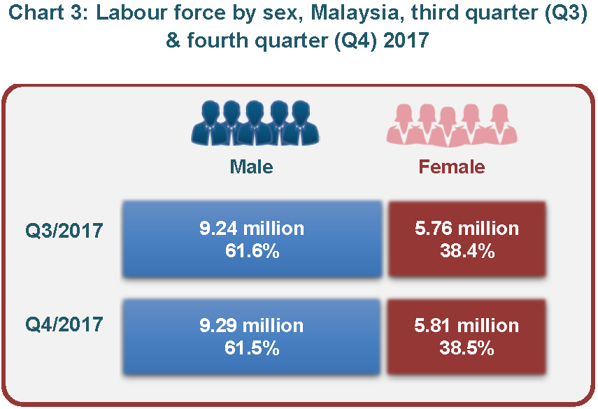 In the fourth quarter 2017, there was 38.5 per cent females in the labour market, an increase of 0.1 percentage point or 52,500 persons to 5.81 million persons as compared to the last quater.