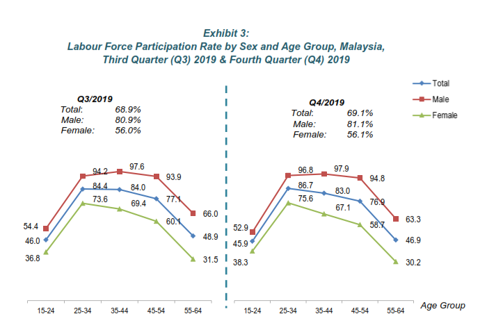 Female LFPR in the fourth quarter of 2019 was 56.1 per cent at the national level, rose 0.1 percentage points as compared to the previous quarter. The highest female LFPR in the labour market were the age group of 25-34 years (75.6%) followed by 35-44 years (67.1%) and 45-54 years (58.7%).
