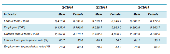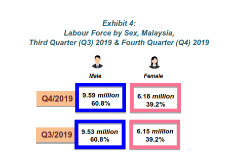 In the fourth quarter of 2019, the labour force comprised of 60.8 per cent male (9.59 million) and 39.2 per cent female (6.18 million). The number of labour force for both male and female increased by 60,073 persons and 32,369 persons respectively as compared to the third quarter of 2019.