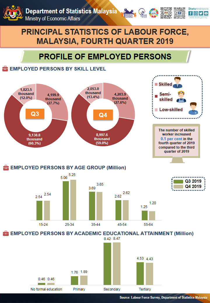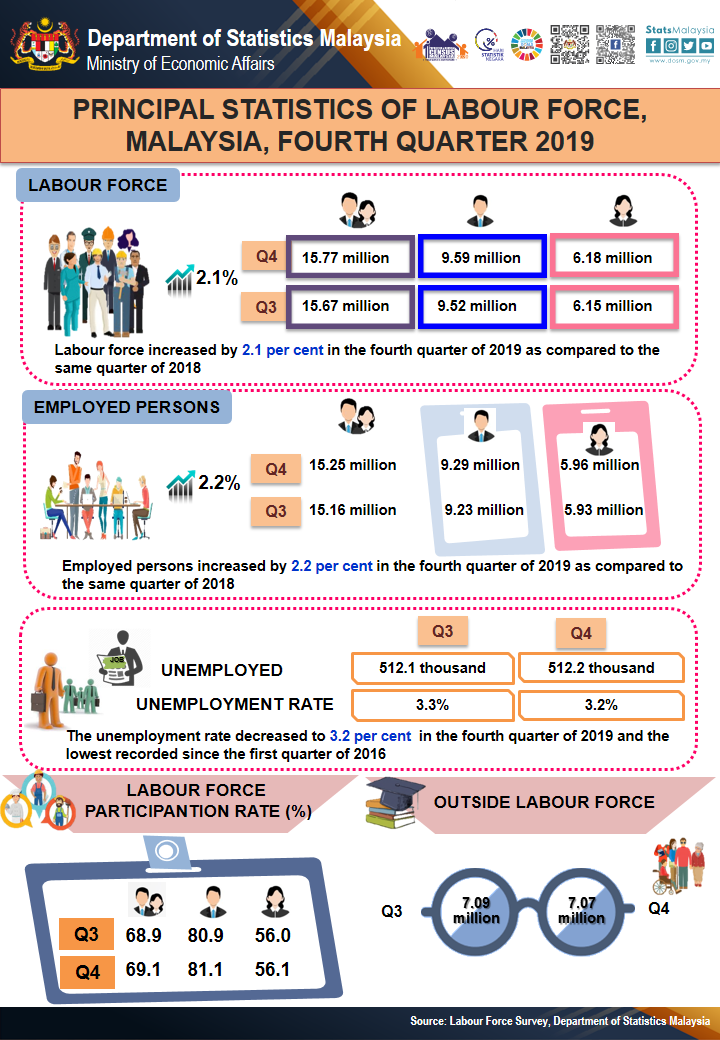 Labour force and employed persons in Malaysia recorded a growth of 2.1 per cent and 2.2 per cent as compared to the fourth quarter of 2018 to 15.77 million persons and 15.25 million persons respectively.