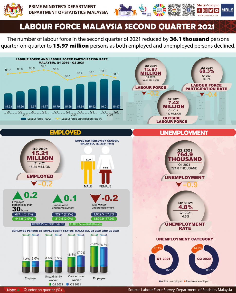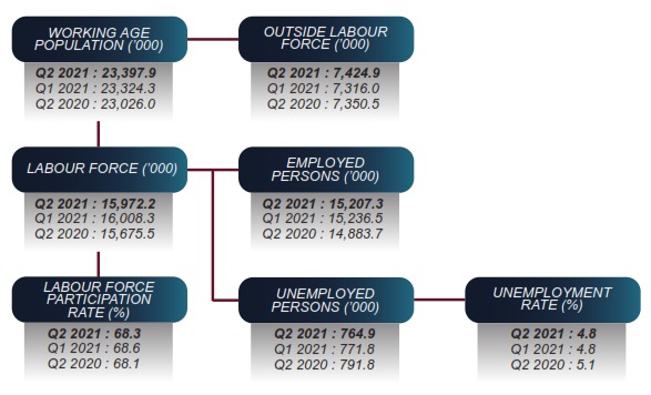 Year-on-year comparison, labour force registered an addition of 286.7 thousand persons (Q2 2020: 15.68 million persons) while LFPR went up by 0.2 percentage points from 68.1 per cent (Q2 2020).