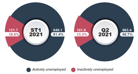 Among the unemployed persons, 86.7 per cent (663.4 thousand persons) were actively unemployed, increased 3.8 percentage points from 82.9 per cent in Q1 2021. The number of inactively unemployed or discouraged group who thought there would be no work available declined by 30.2 thousand persons to 101.6 thousand persons in Q2 2021 (Q1 2021: 131.7 thousand persons). [Chart 2]