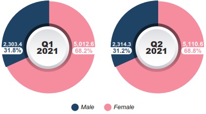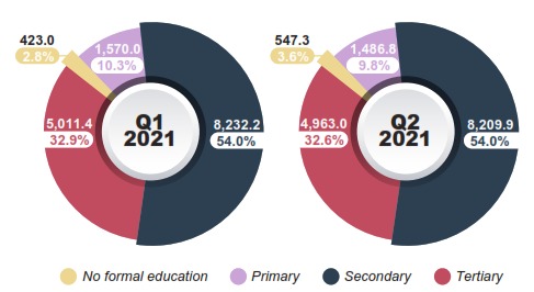 In the second quarter of 2021, labour force dropped 0.2 per cent quarter on quarter or equivalent to 36.1 thousand persons to record 15.97 million (Q1 2021: 16.01 million persons). Accordingly, the labour force participation rate (LFPR) showed a decline during the quarter with a reduction of 0.3 percentage points to record 68.3 per cent (Q1 2021: 68.6%).