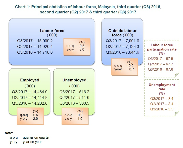 Labour force participation rate (LFPR) in third quarter 2017 was 67.9 per cent, rose 0.2 percentage point compared to second quarter 2017. Hence, another 32.1 per cent of the working age population were outside the labour force. Meanwhile, unemployment rate remained unchanged at 3.4 per cent for two consecutive quarters.