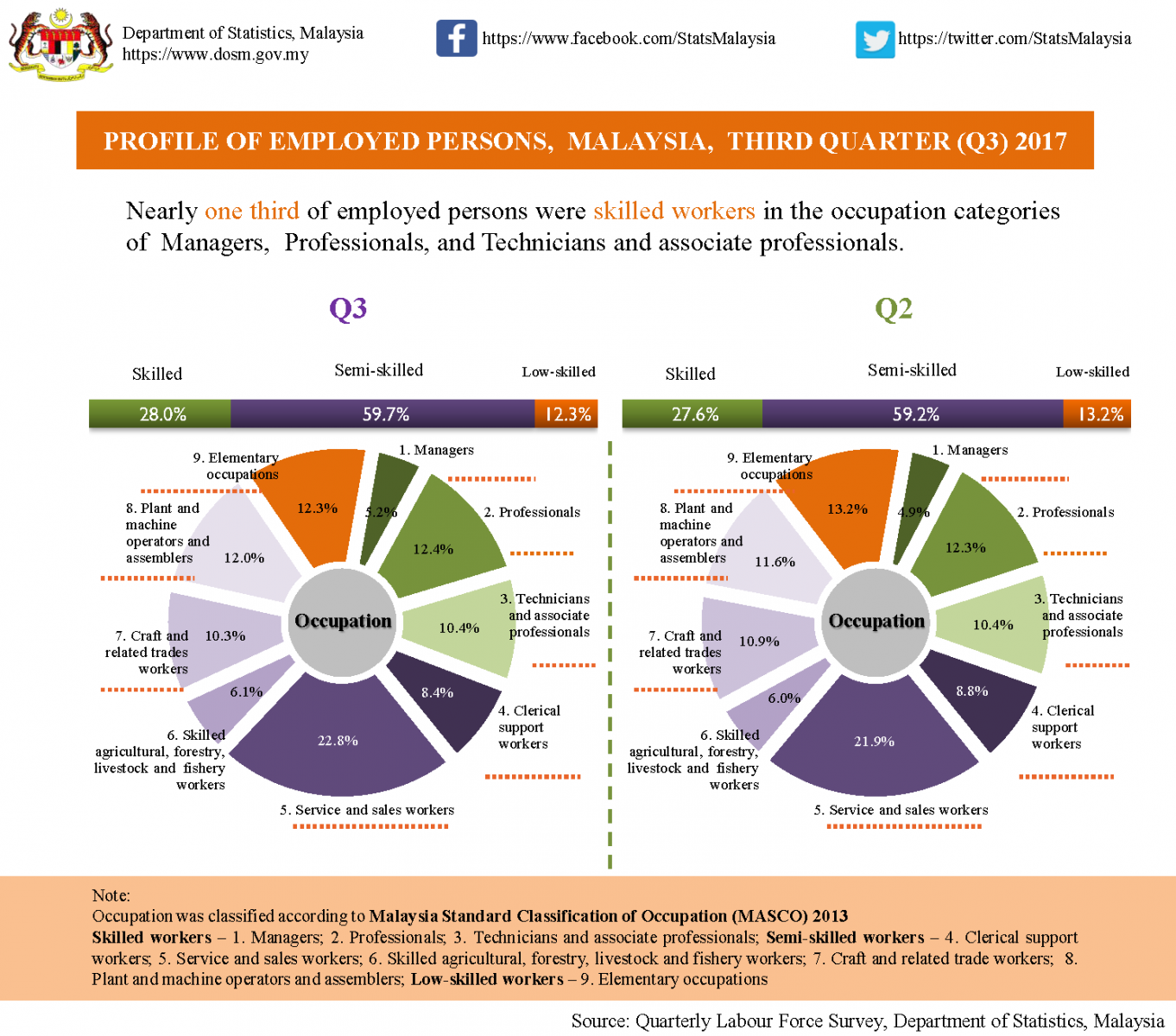 Labour force in Malaysia increased 0.5 per cent to 15.00 million persons in third quarter 2017 compared to 14.93 million persons in the previous quarter. The rise was contributed by the increase of 69,200 employed persons to 14.48 million persons as well as the increase of 4,600 unemployed persons to 516.2 thousand persons.