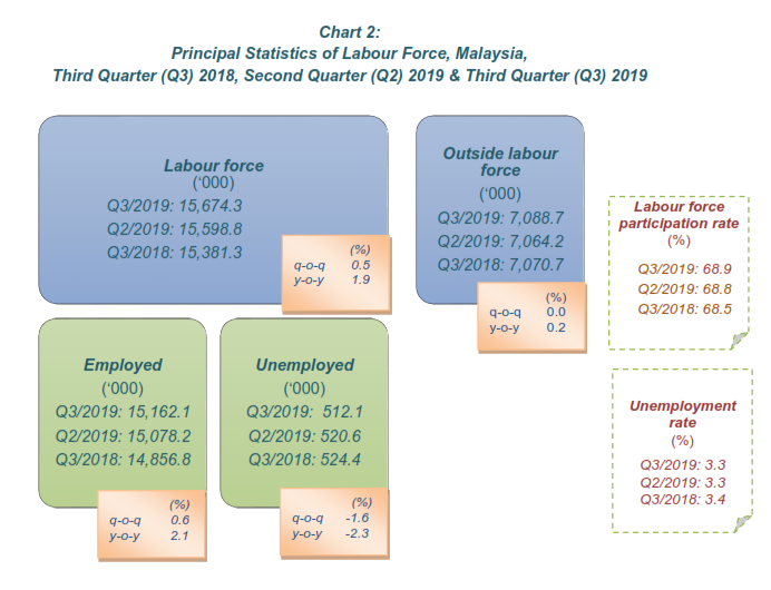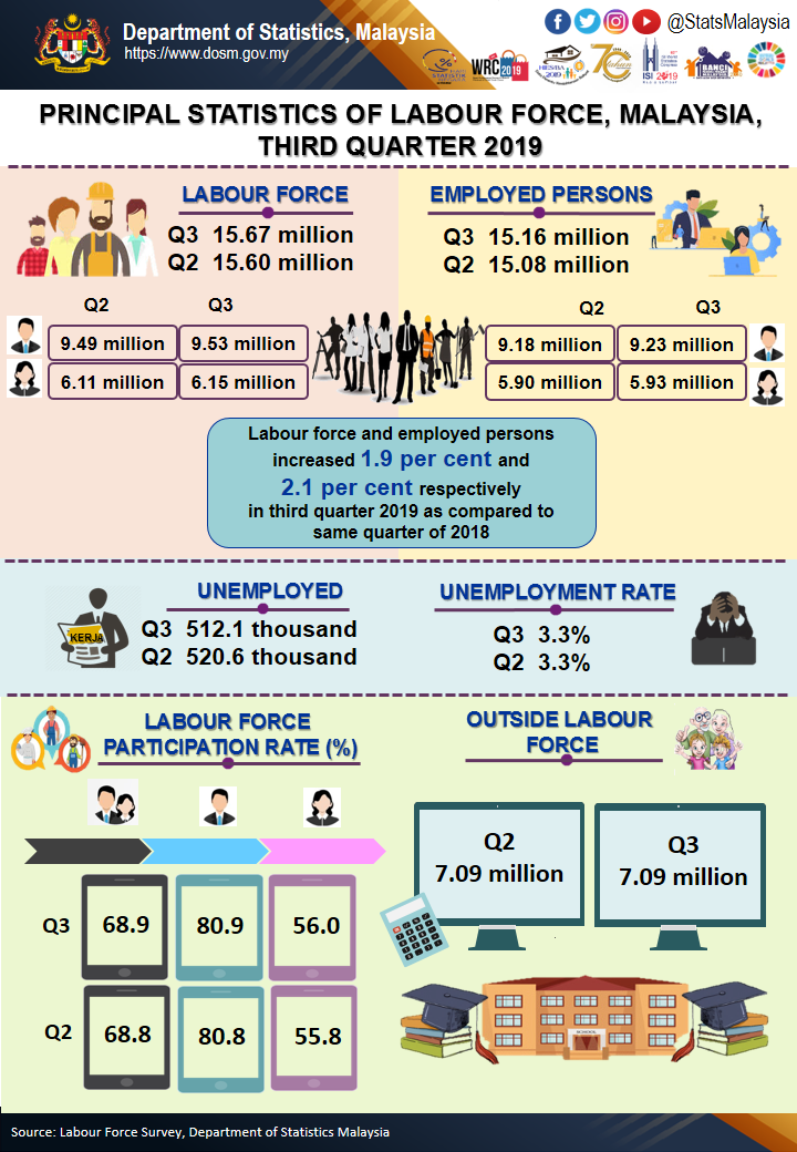 Labour force and employed persons in Malaysia recorded a growth of 1.9 per cent and 2.1 per cent as compared to the third quarter of 2018 to 15.67 million persons and 15.16 million persons respectively.