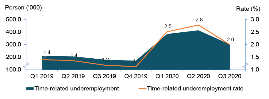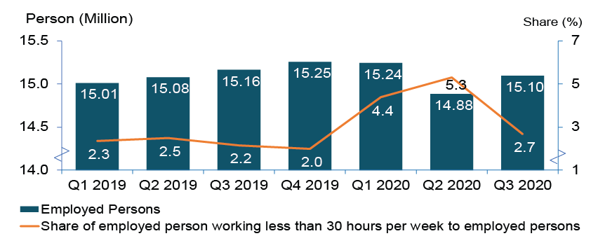 Employed person working less than 30 hours per week refers to those who worked less than 30 hours during the reference week because of the nature of their work or due to insufficient work. For the third quarter of 2020, the number of employed persons who working less than 30 hours per week reduced 385.8 thousand persons to record 403.8 thousand persons (Q2 2020: 789.6 thousand persons).